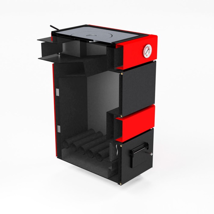 - Котел має достатньо велику площу теплообміну, за рахунок водяної рубашки навколо топки.