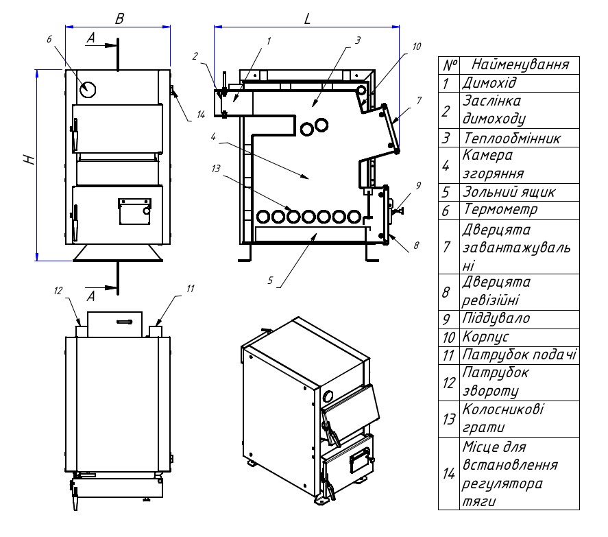 Площа обігріву - від 100 до 180 м2. Підходить для використання такого палива: різні види дров, вугля, брикетів та ін.
